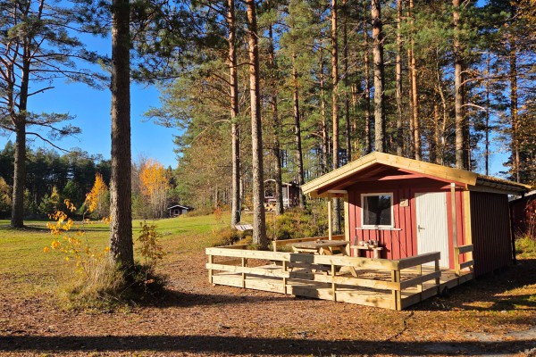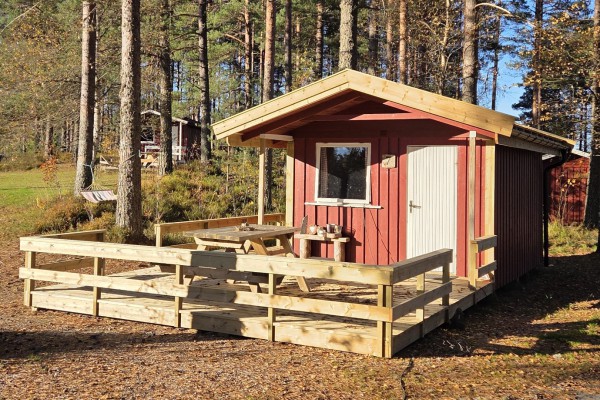 Beautifully situated between the pine trees and quite centrally on the campsite. The hut has a small veranda and ample space in front of the hut to sit outside. The cabin is equipped with 2 single bunk beds, a dining area and a simple kitchenette with a refrigerator, hob, coffee maker, kettle, cooking utensils and crockery. There is no running water in this cabin, but there is a jerry can for drinking water available. For shower and toilet you use the camping sanitary building.